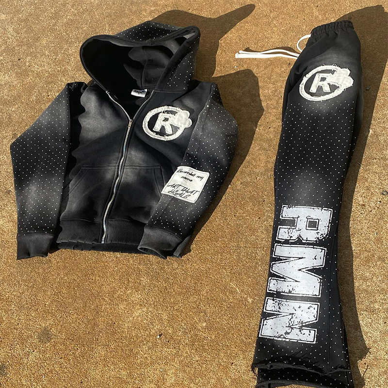 Felpa con cerniera integrale Unisex stampata su misura e pantaloni della tuta impilati Set tuta da ginnastica Vintage da uomo